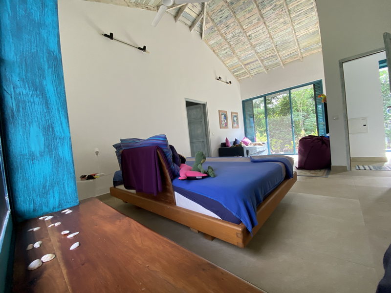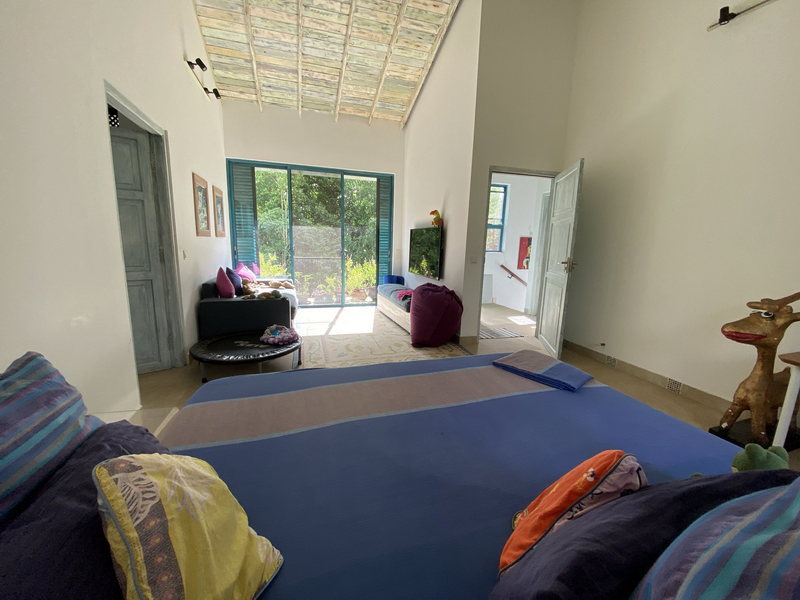 2nd bedroom with 300 cm wide sliding doors (glass, mosquito screen, louver) to the sculpture garden in the east