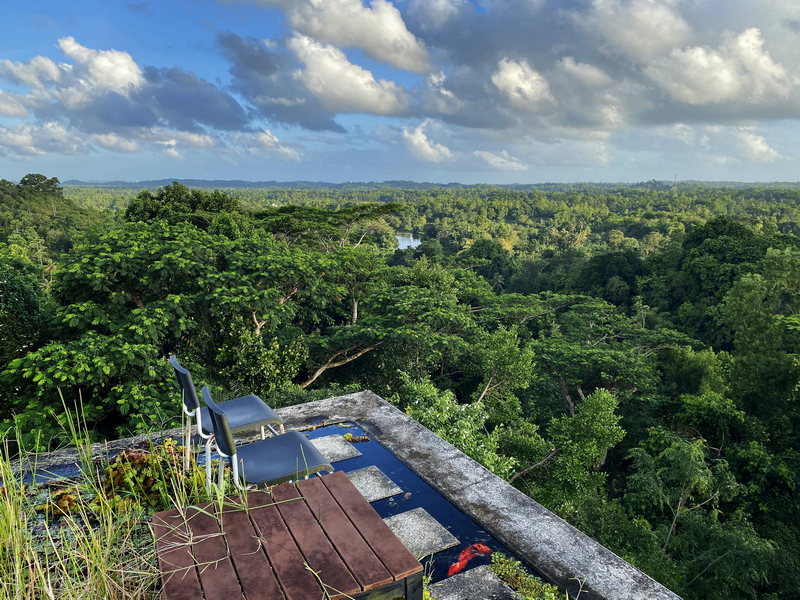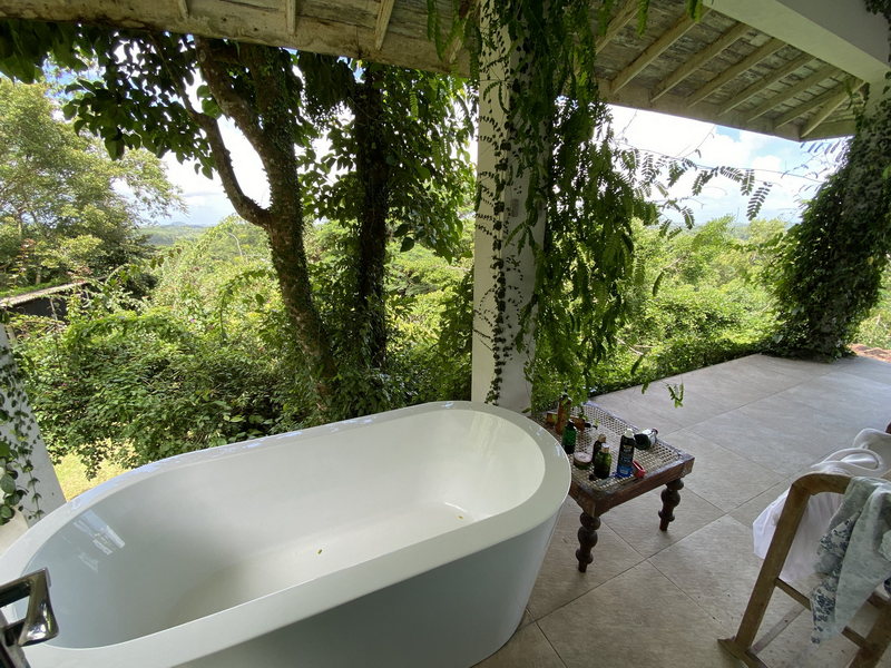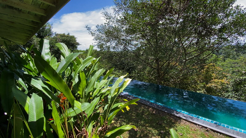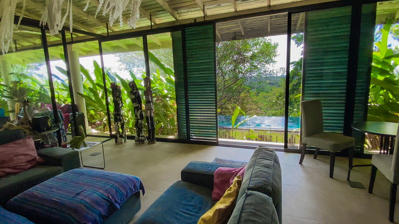 Veranda when heliconia are cut down: 1.5° C warmer, more light. Genius: sliding louvers can be positioned to shade wherever you sit.